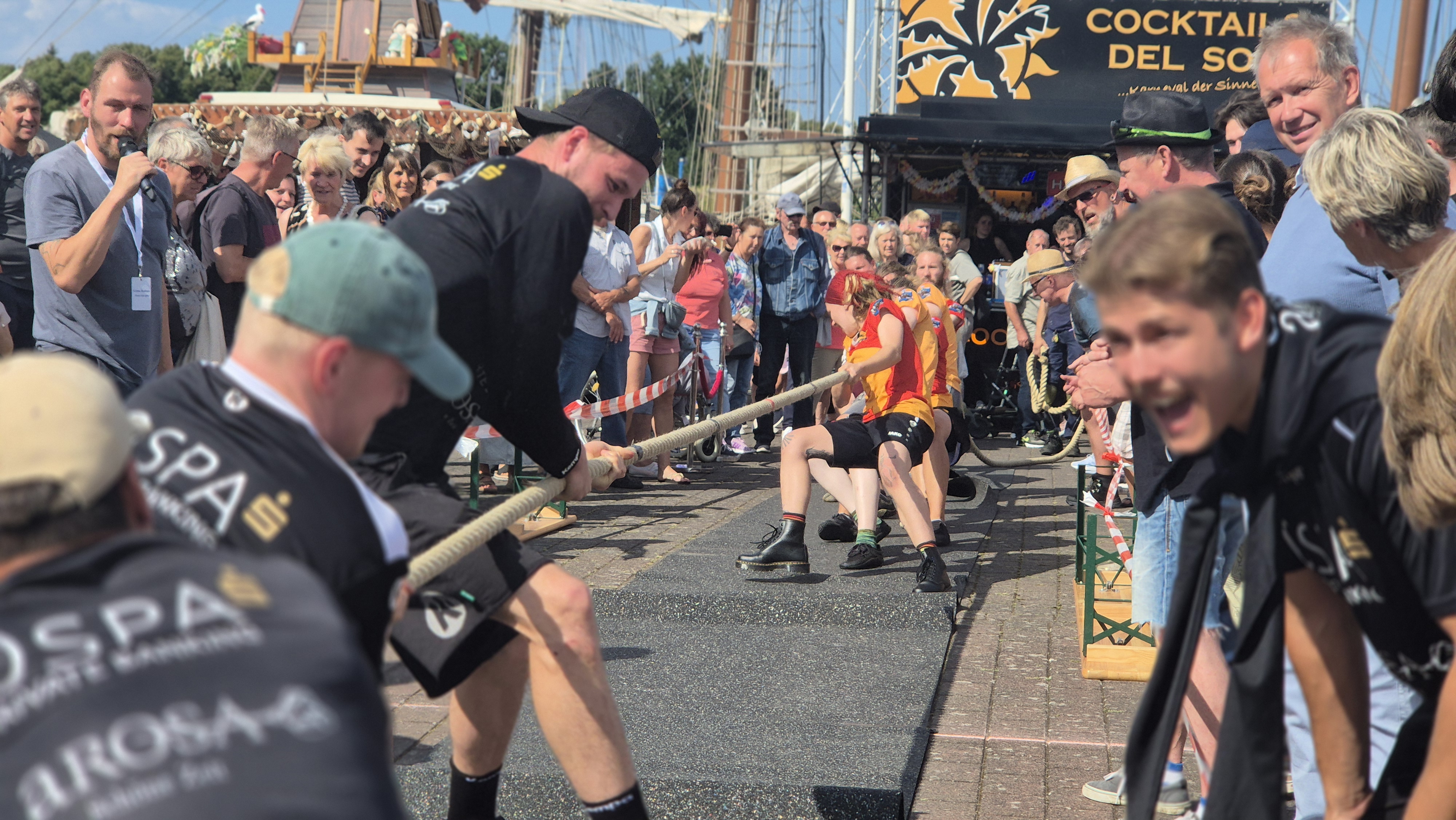 Zum ersten Mal veranstaltet das Hanse Sail-Büro ein Turnier im Tauziehen – und stellte auch gleich selbst eine Mannschaft auf. Den ersten Sieg holten sich aber die Männer und Frauen vom Likedeeler e.V.. Bei den Männern siegte der HC Empor Rostock. Es könnte der Beginn einer neuen Tradition sein, dank der Kloska Group.